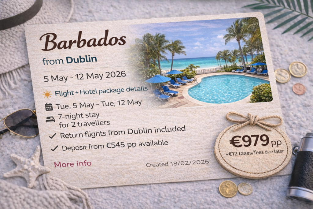 Direct flights from Dublin to Barbados from €450 return. Travel dates available in April and May 2026. Enjoy tropical beaches, warm Caribbean weather and vibrant island culture. Limited availability —…