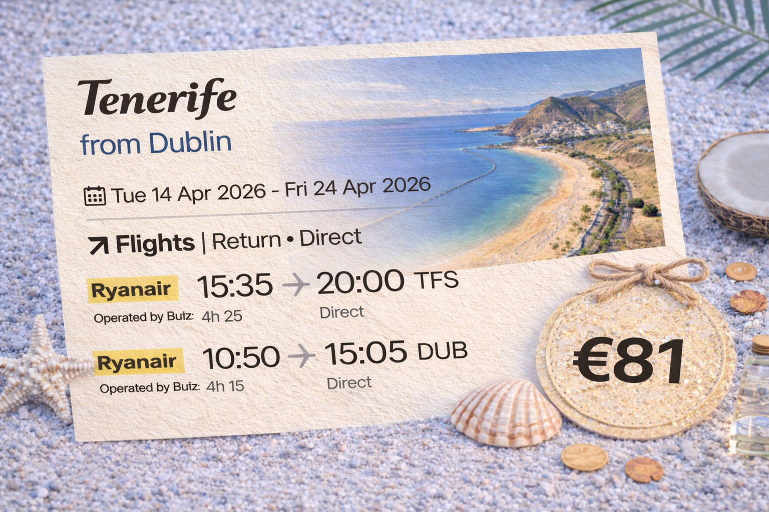 Tenerife is one of the Canary Islands’ most popular destinations — perfect for year-round sunshine, volcanic landscapes and relaxed beach holidays just a short direct flight from Dublin.